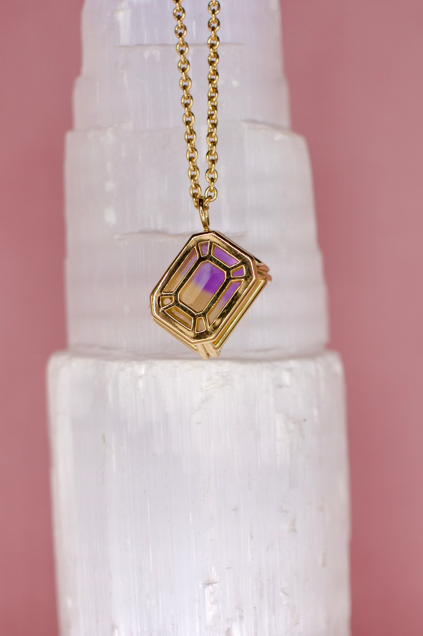 A bold expression of color and elegance. This one-of-a-kind necklace features an 11.07ct emerald-cut Ametrine, showcasing the natural gradient of golden citrine and violet amethyst within a single stone. The gem is set in 18K yellow gold, suspended from a delicate 2mm cable chain that offers the perfect balance of strength and simplicity.