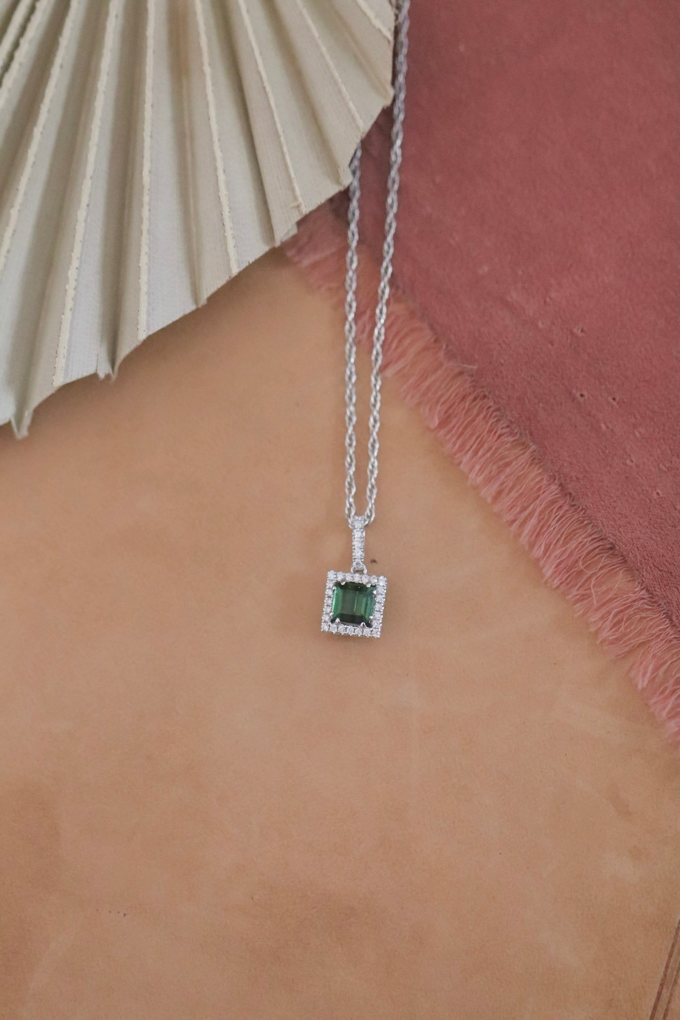 An elegant blend of modern design and natural beauty. This 18k white gold and sterling silver necklace (18") features a striking 1.14 carat emerald-cut tourmaline, radiating rich green brilliance. The center stone is framed by 30 round diamonds totaling 0.13 carats, adding a subtle halo of sparkle that enhances its vivid hue. A refined statement piece that celebrates both craftsmanship and color.