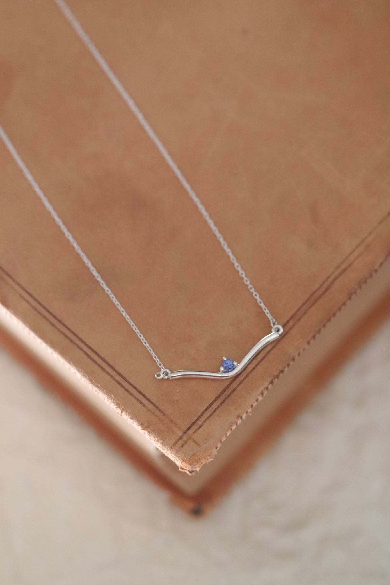A minimalist nod to Montana’s natural beauty. This sterling silver necklace features a sleek curved bar adorned with a single 0.07 carat round Yogo sapphire, ethically sourced and set in-house by our skilled goldsmith. The subtle curve and delicate gemstone create a modern, versatile piece perfect for everyday wear or layering.