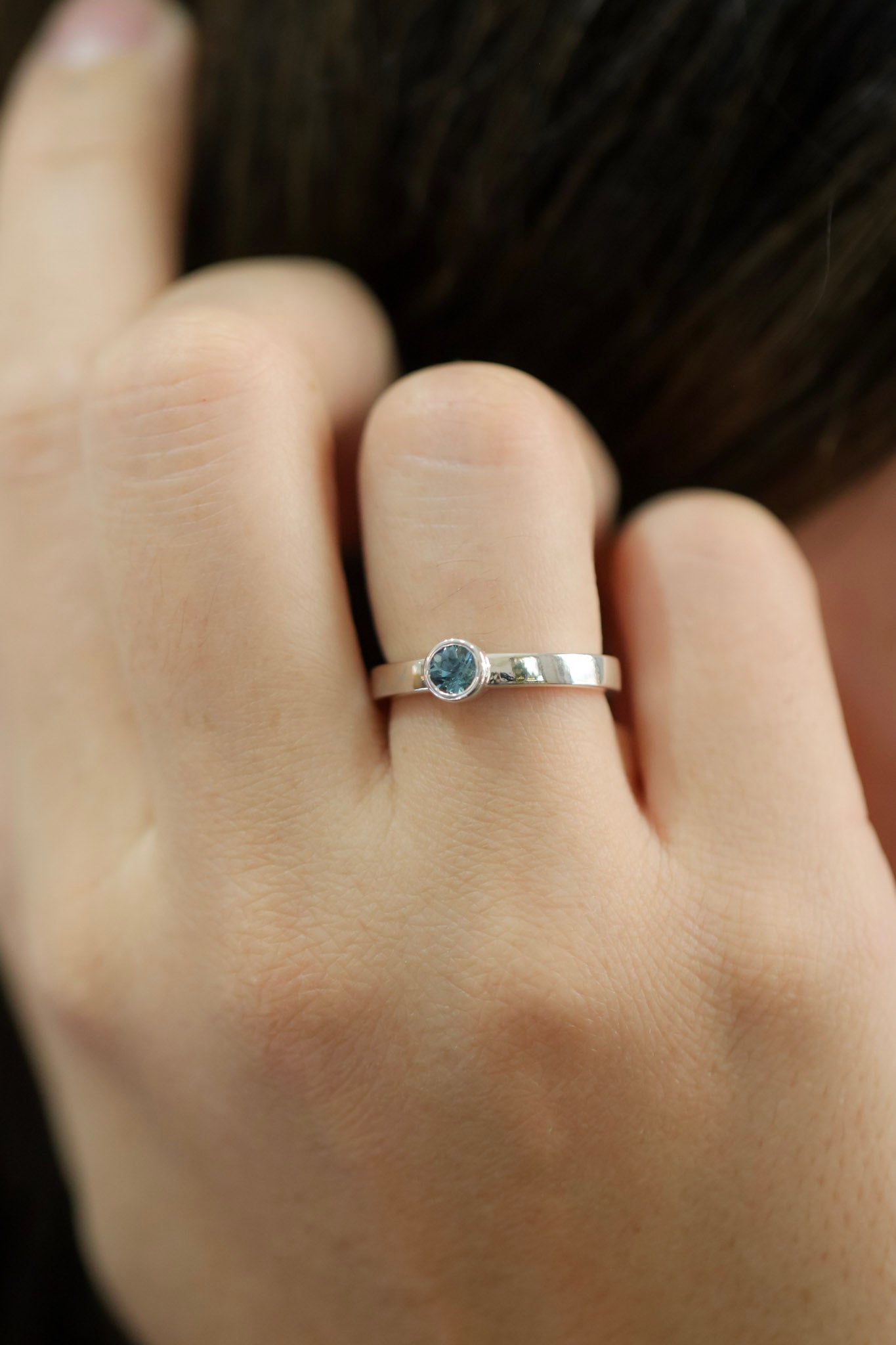 A sleek and modern take on classic elegance. This sterling silver ring features a 0.33 ct round Montana sapphire set in a bezel setting, highlighting the gem’s natural beauty while providing a secure, contemporary design. Set in-house by our goldsmiths for meticulous craftsmanship.