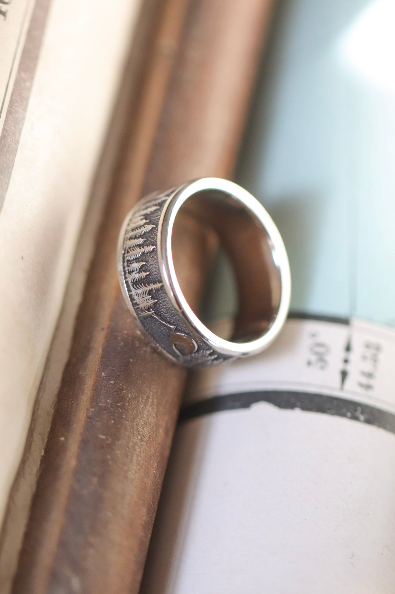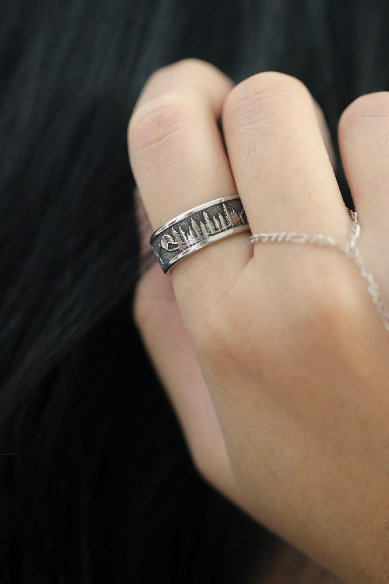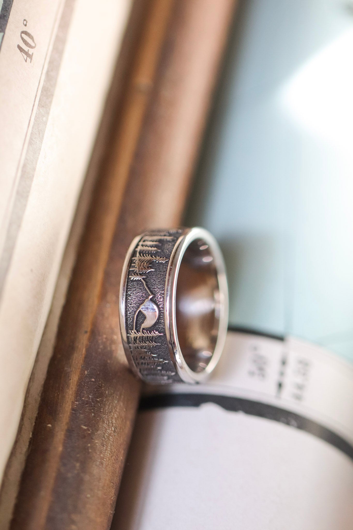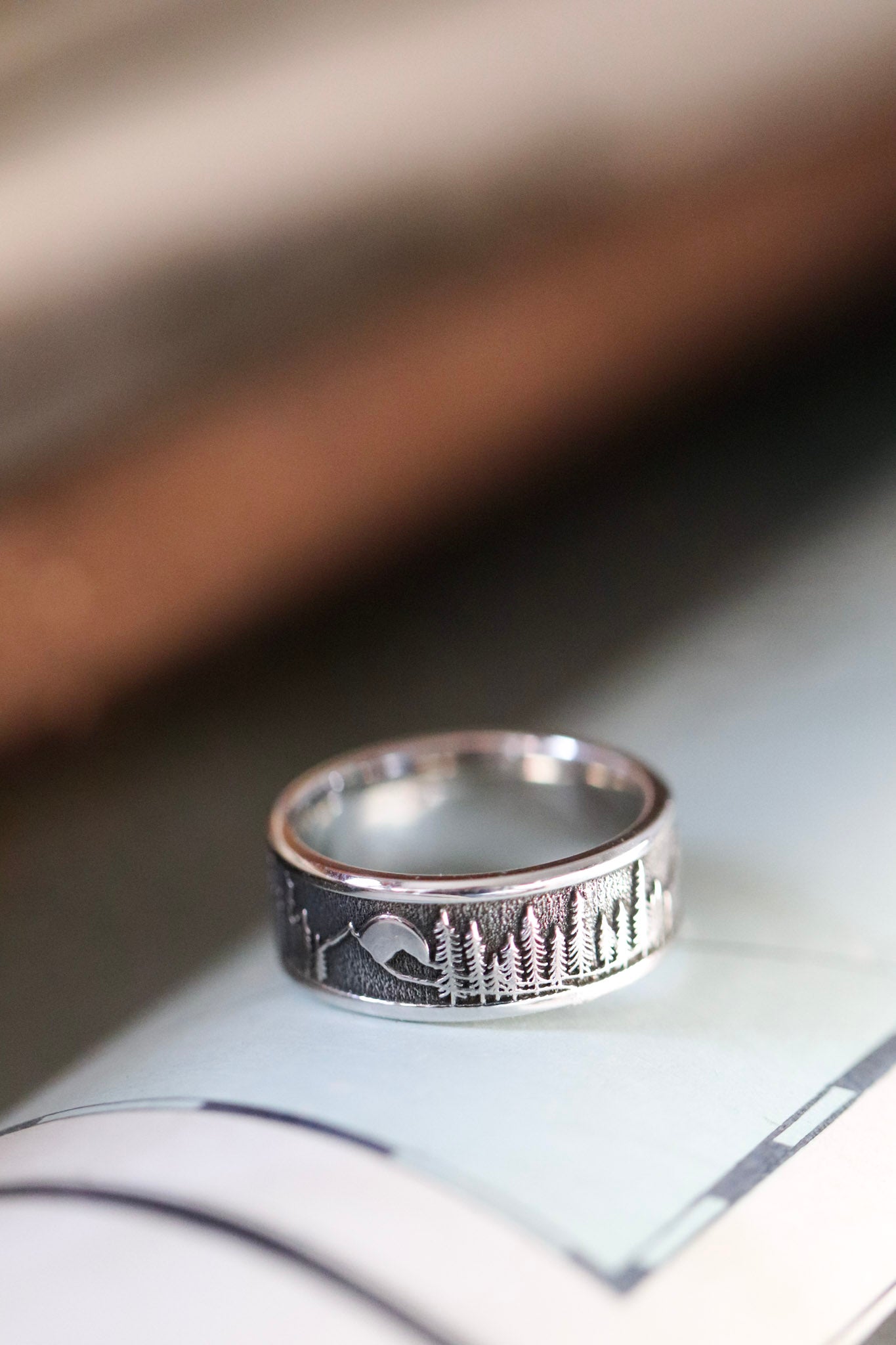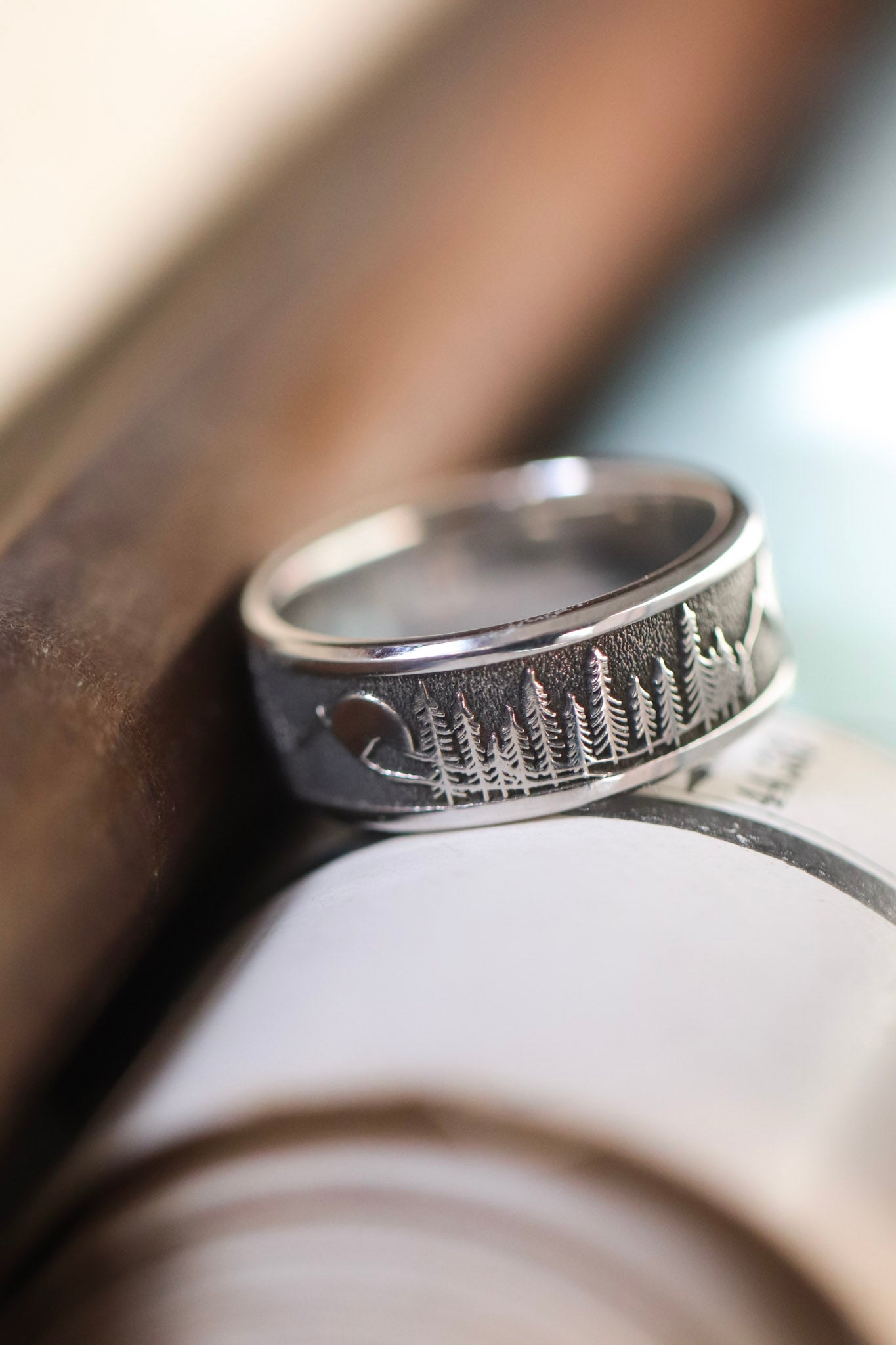 A meaningful design from the Katelynne Eslick Designs Collection. This 10k white gold wedding band (size 9, 8mm width) is accented with black rhodium and showcases a finely detailed laser-engraved forest and mountain scene, hand-drawn by designer Katelynne Eslick to flow perfectly with the band. A unisex style that blends rugged character with refined craftsmanship, this band is perfect for nature lovers and adventurers alike.
