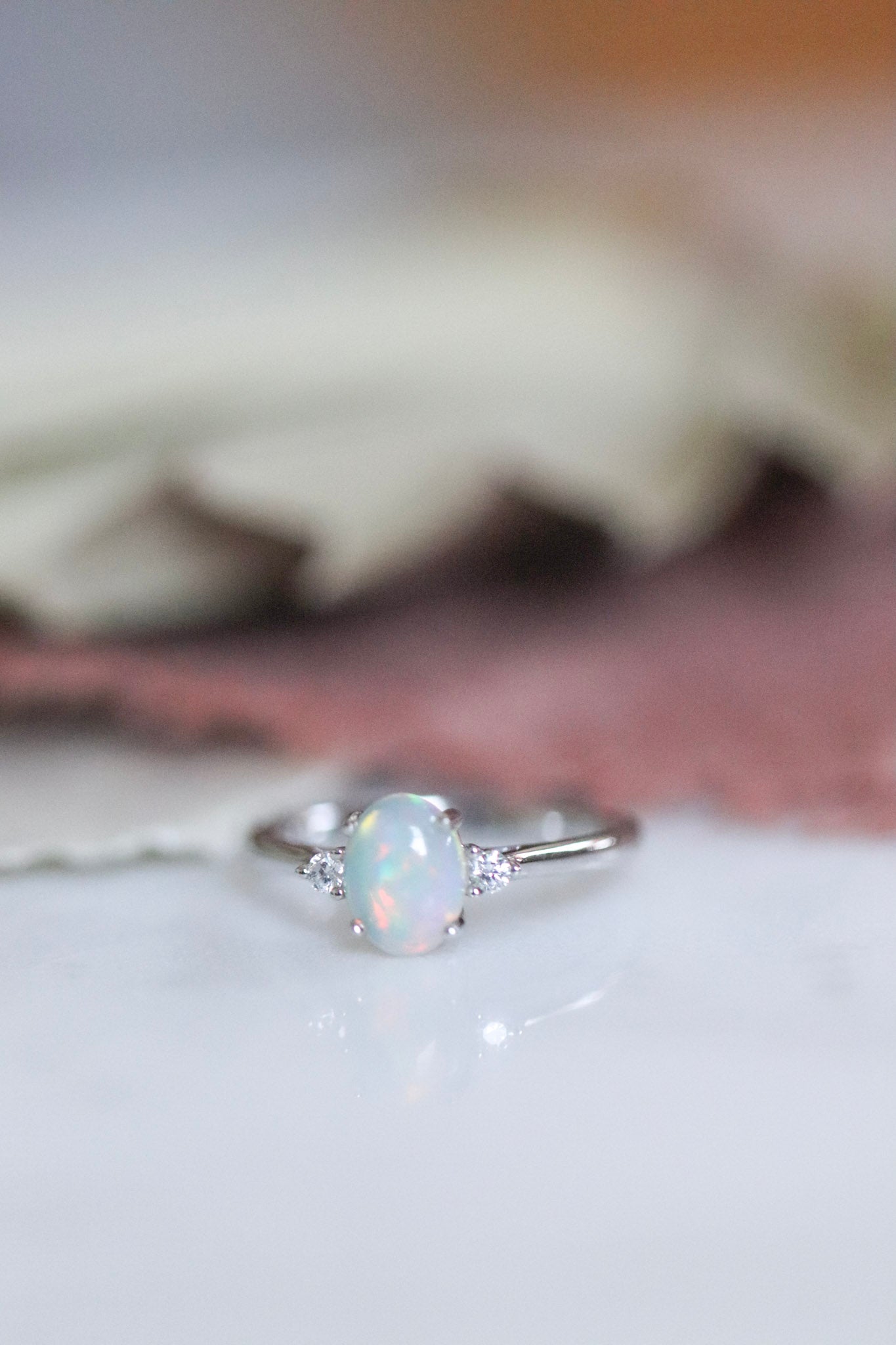 This elegant 14K white gold fashion ring showcases a 0.82 ct oval opal, glowing with its signature play-of-color. It’s accented with 0.08 tw round diamonds, adding a touch of sparkle that beautifully complements the center stone’s iridescence.