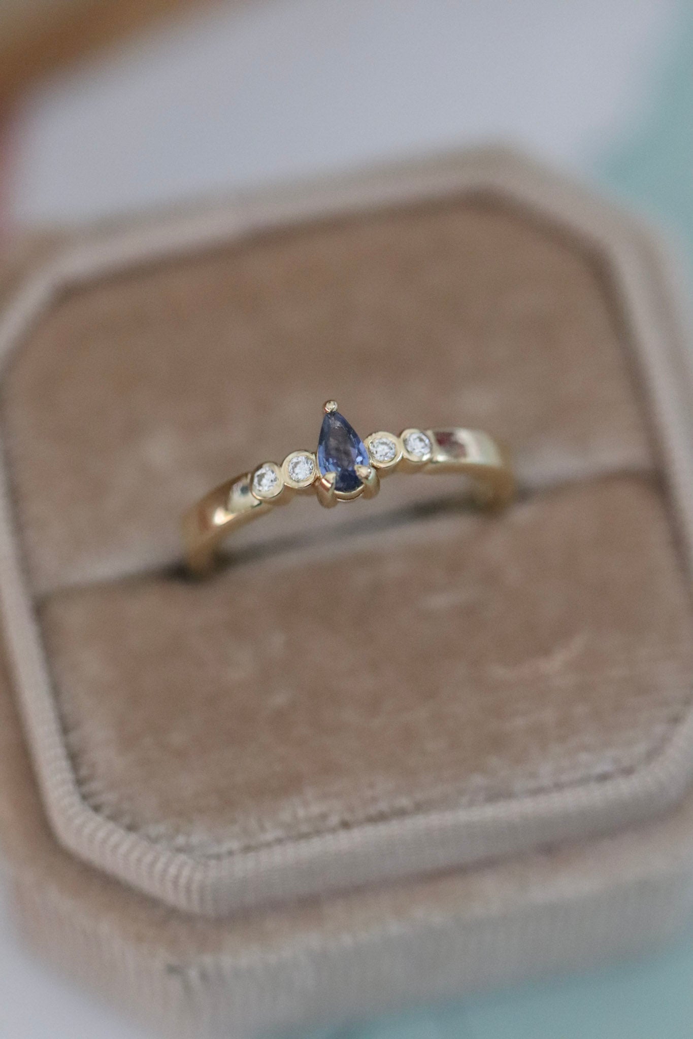 A graceful design that highlights Montana’s rare Yogo sapphire. This 14k yellow gold ring features a 0.185 carat pear-shaped Yogo sapphire, accented by four sparkling round diamonds for a timeless and elegant look.