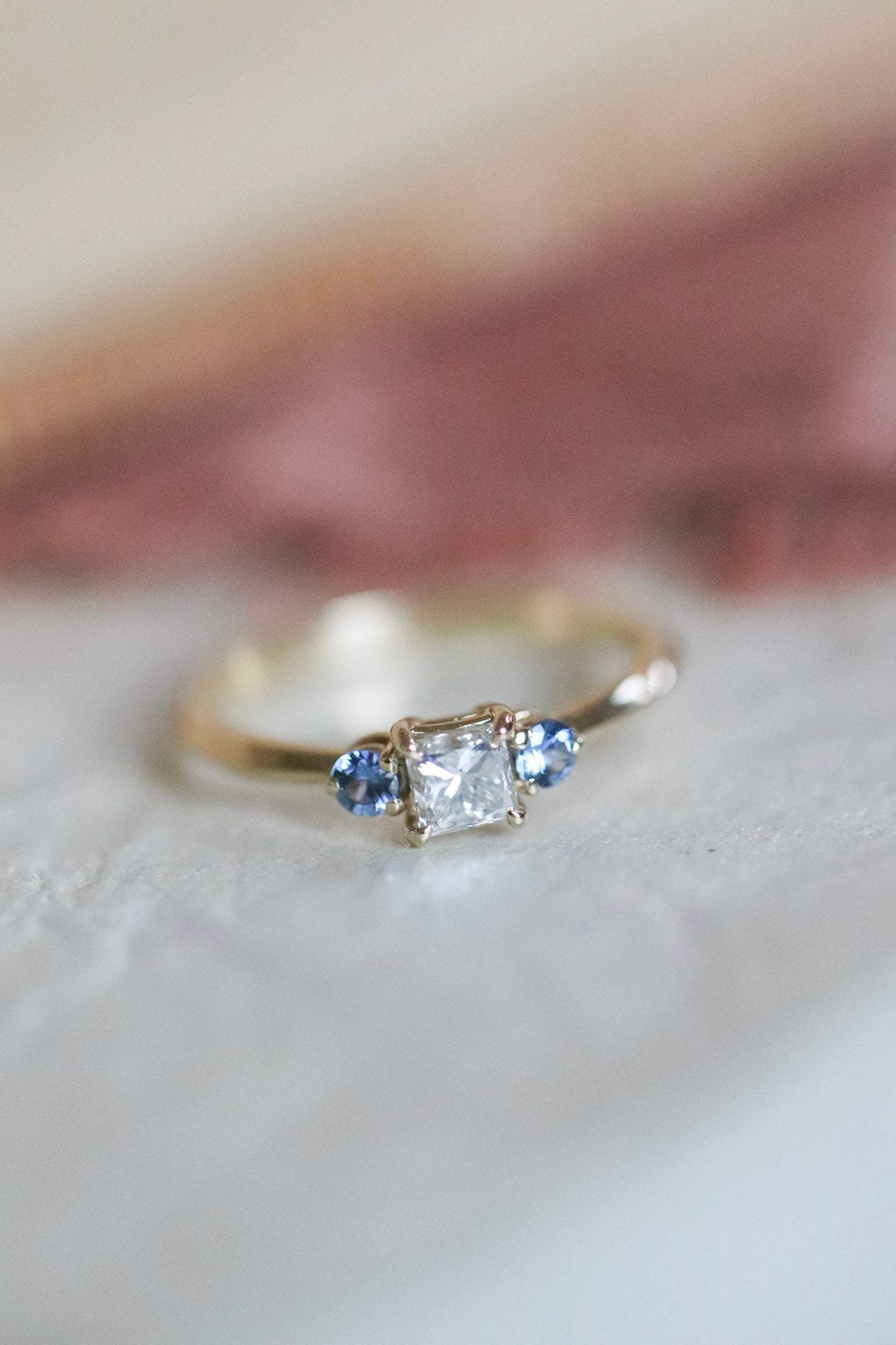 This stunning three-stone ring features a brilliant 0.50ct princess-cut I/Si2 diamond, flanked by two vibrant round Yogo sapphires totaling 0.16tw. Set in warm 14K yellow gold, the combination of crisp diamond sparkle and Montana’s rare Yogo sapphire blue creates a timeless and meaningful piece.