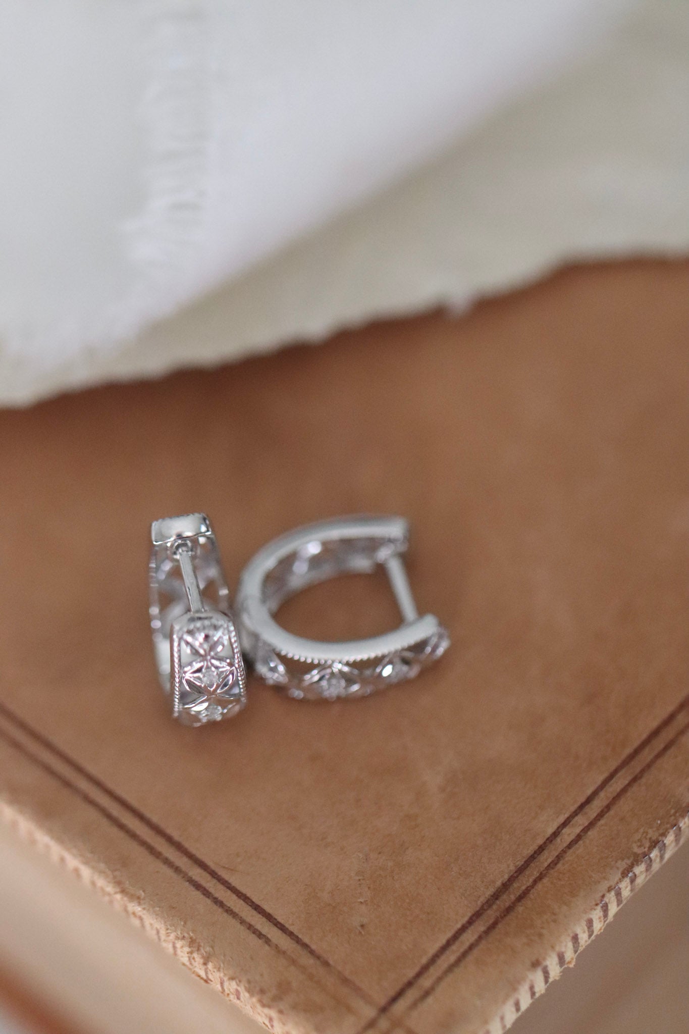 A delicate blend of nature and sparkle. These sterling silver hoop earrings feature 0.04 carats total weight of round natural diamonds set within a subtle floral-inspired design, adding charm and texture to a classic hoop silhouette. Perfect for everyday elegance or a refined statement piece.