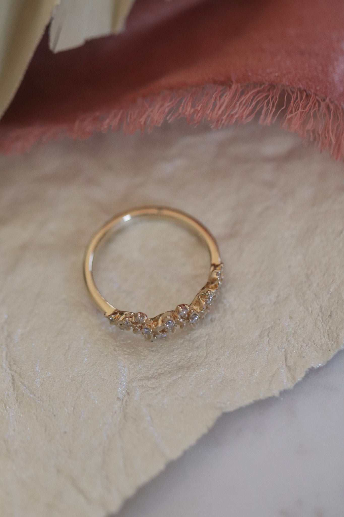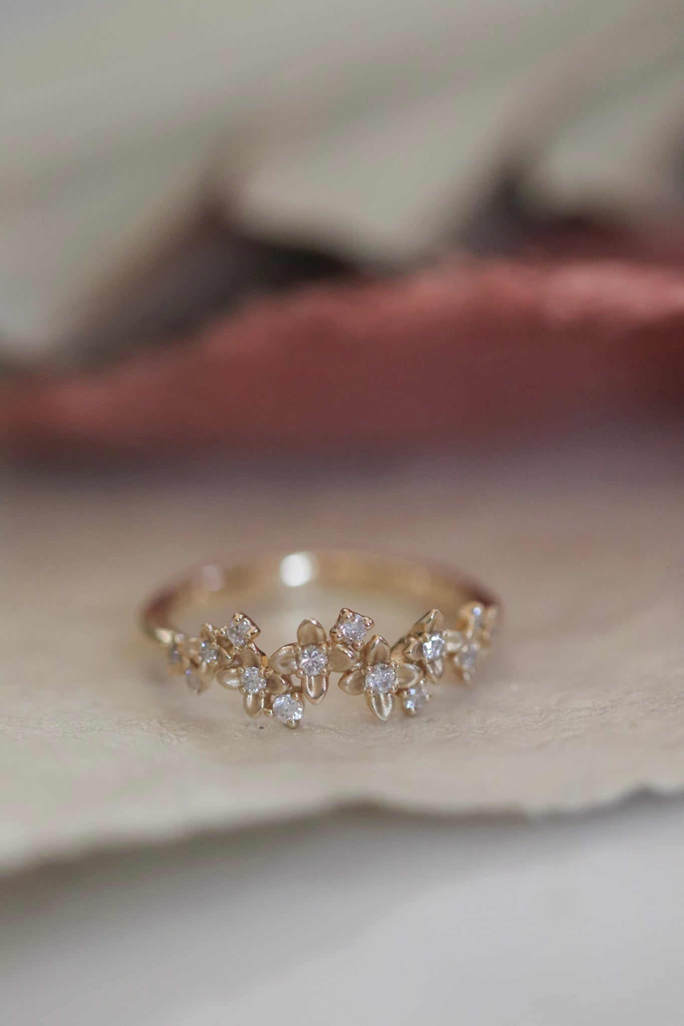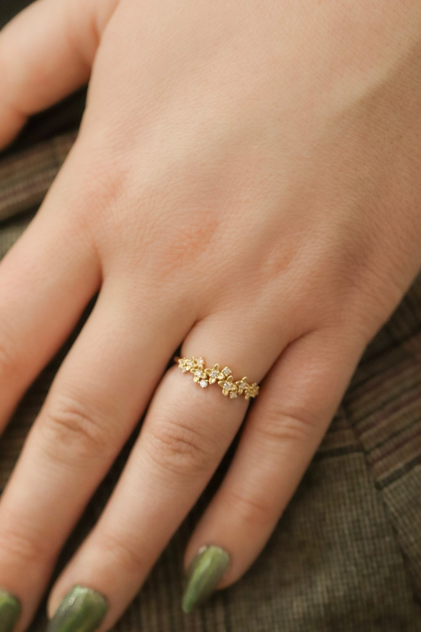 A delicate bloom of sparkle. This 14K yellow gold ring (size 6.5) features a flower-shaped design adorned with 0.16 carats total weight of round natural diamonds, creating a feminine and elegant look perfect for everyday wear or special occasions.
