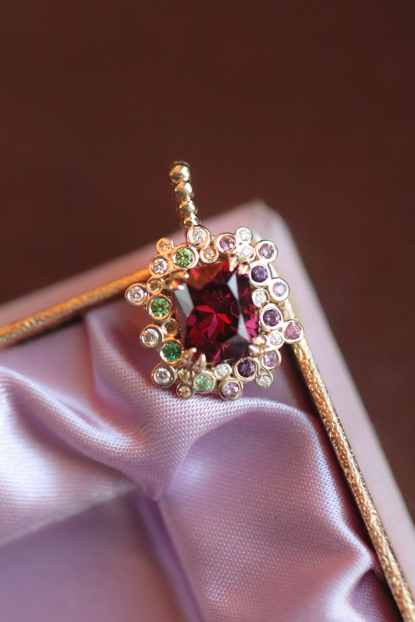 The Bonbon necklace from Katelynne's Rock Candy Collection is a lively mix of color and sparkle. Its 2.36 ct reddish-purple cushion tourmaline takes center stage, accented by 0.08 ctw diamonds, 0.08 ctw pink sapphires, 0.06 ctw tsavorite garnets, and 0.03 ctw garnets, all set in 14k yellow gold. Suspended from an 18” yellow gold cable chain, it’s a playful, unexpected twist on classic elegance.