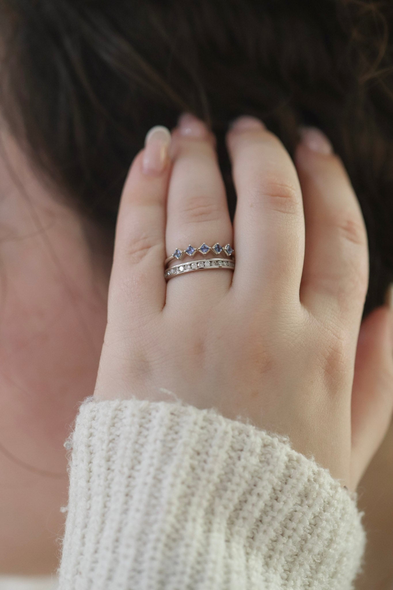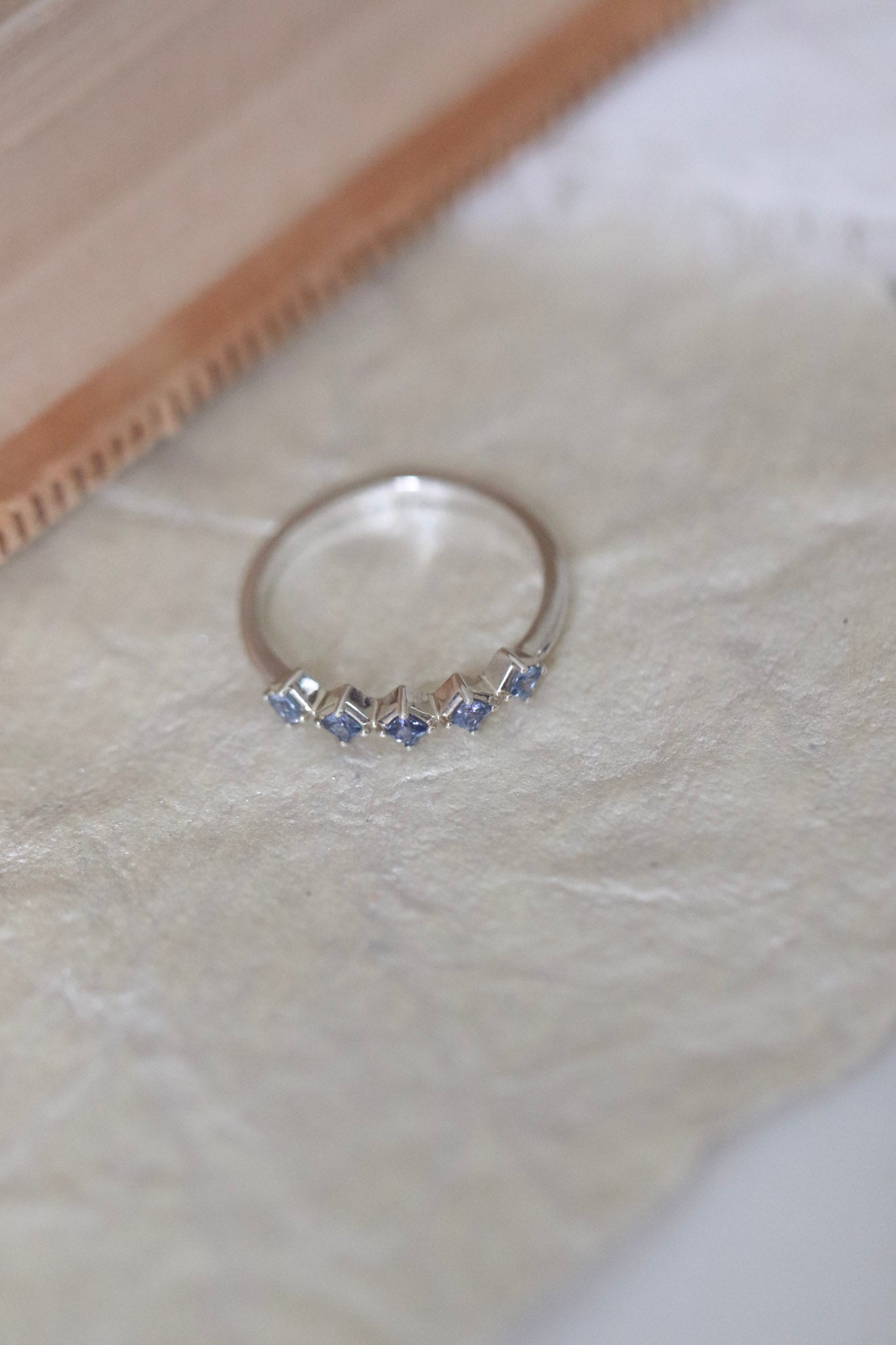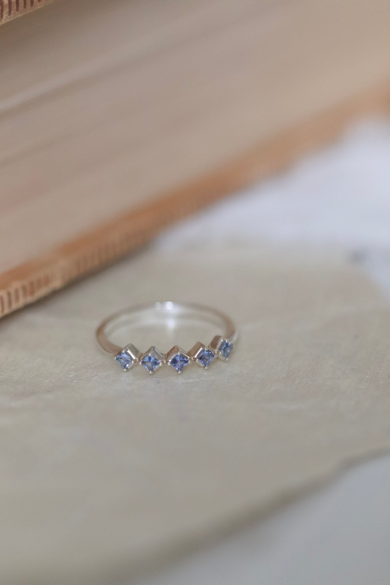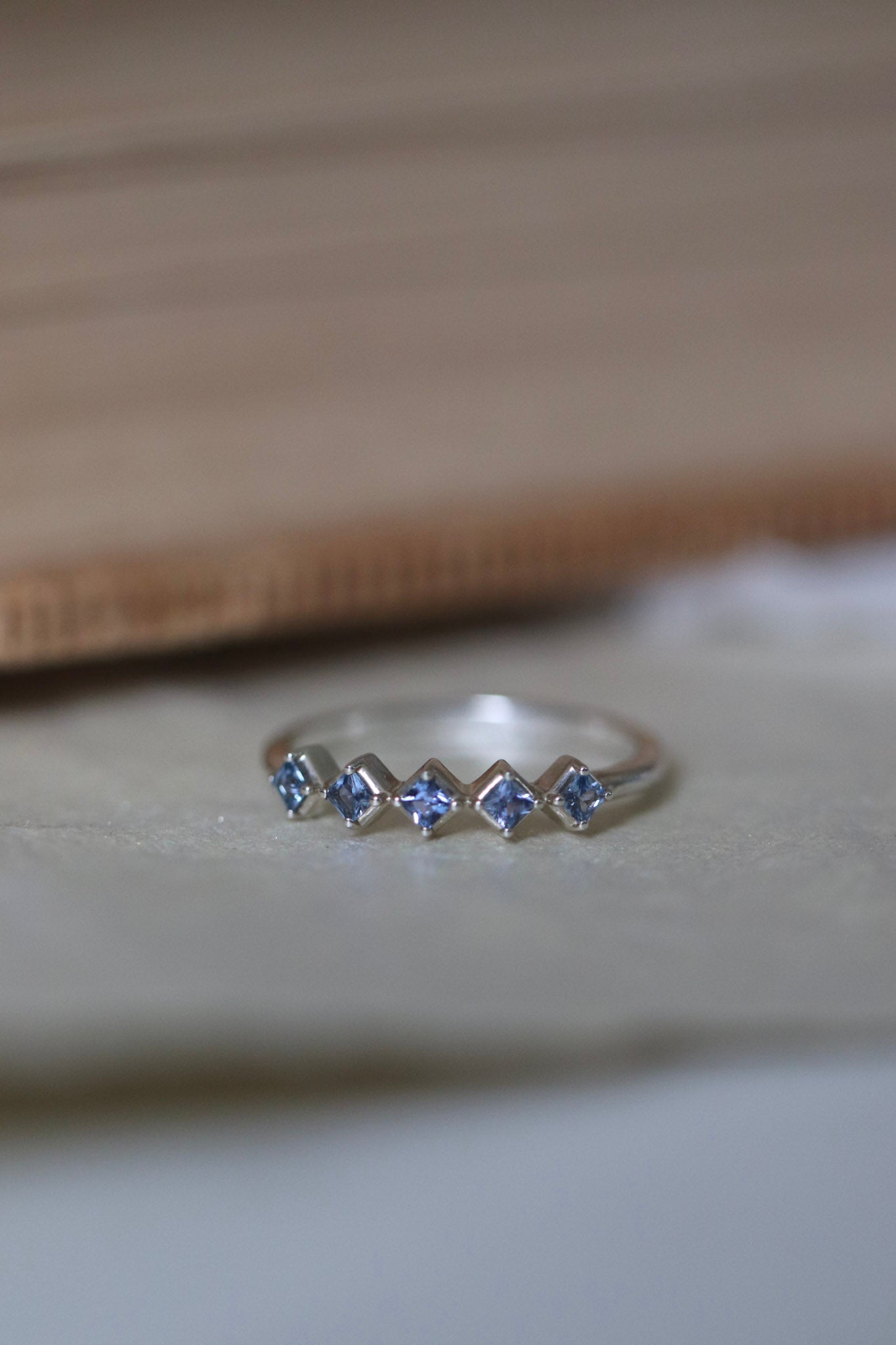 A modern take on Montana’s rare beauty. This sterling silver ring (size 7) features five princess-cut Yogo sapphires totaling approximately 0.20 carats, each ethically sourced and carefully set in-house by our skilled goldsmith. Its sleek, linear design makes it perfect for stacking or wearing alone as a subtle yet striking statement piece.