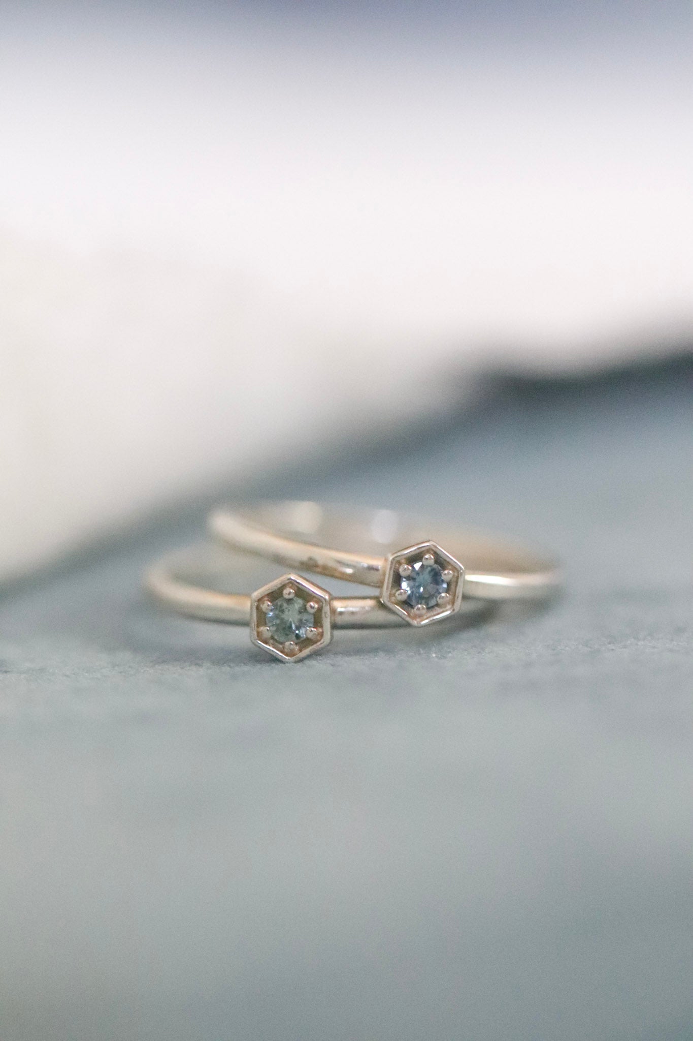 Modern design meets Montana’s natural beauty. This sterling silver ring features a sleek hexagon-shaped setting holding a 0.07 carat round Montana sapphire. Each sapphire is locally sourced and one-of-a-kind, with color options ranging from soft light green to deep teal blue. A minimalist yet meaningful piece that celebrates Montana’s vibrant gemstone heritage.