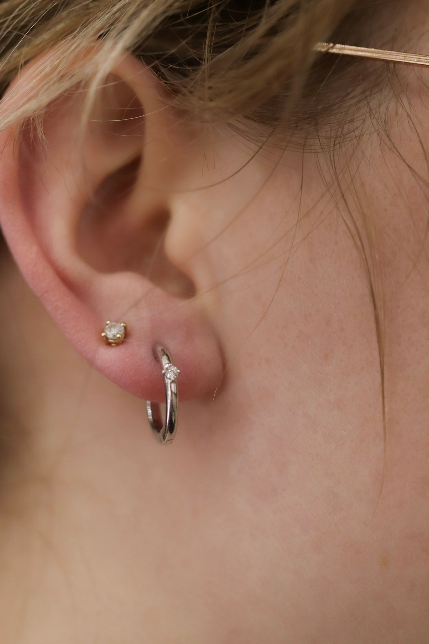 A classic touch of sparkle for everyday elegance. These sterling silver hoop earrings are each set with 0.01 carat total weight of natural round diamonds, providing subtle shimmer and timeless style. Perfect for casual wear or dressing up, these hoops are versatile and refined.