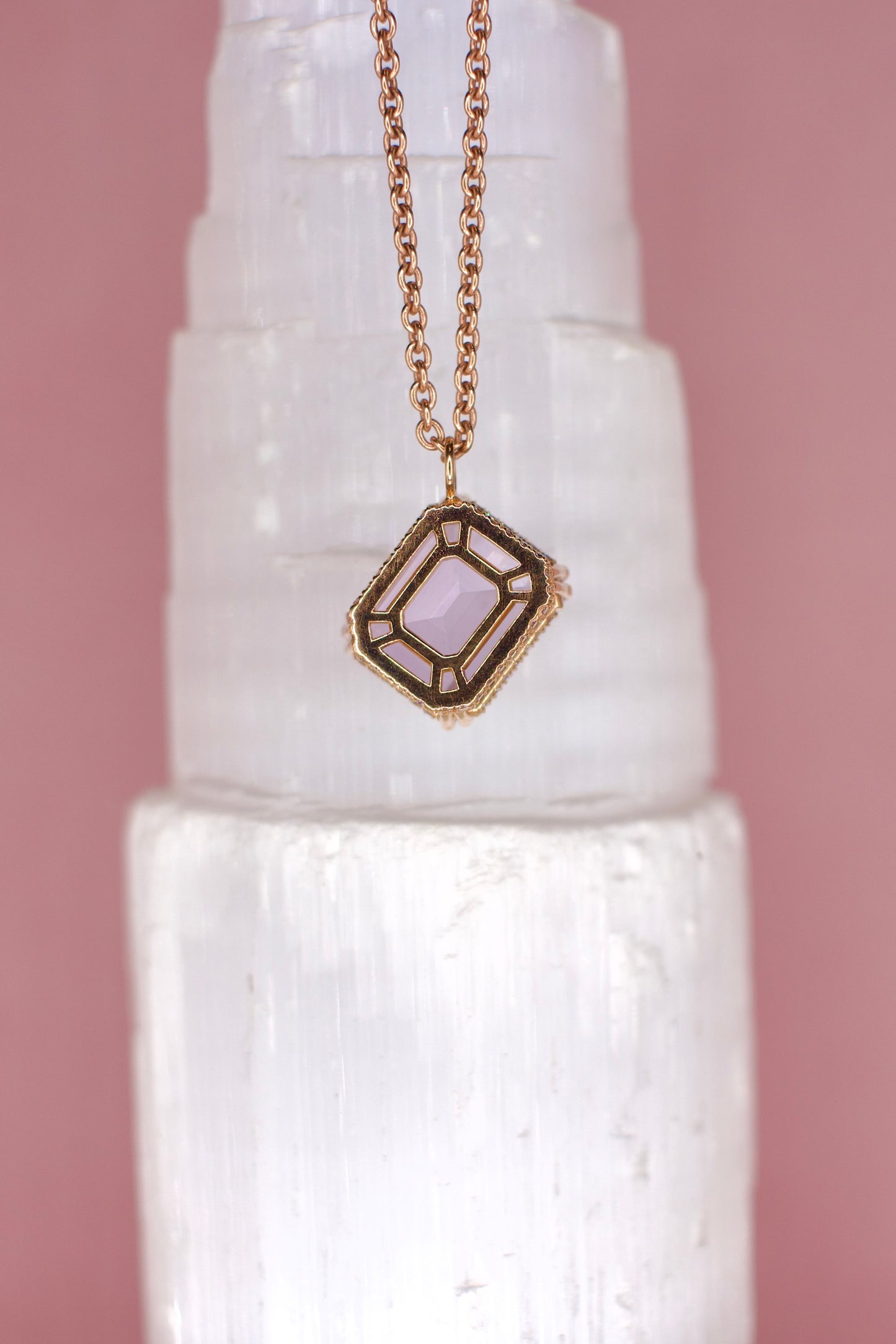 Soft elegance meets modern design. A 7.26ct emerald-cut Lilac Amethyst is framed by .26ctw of EF-VS diamonds, set in 18K rose gold and suspended from a 2mm cable chain. A serene statement piece that captures light, and attention, with every angle.
